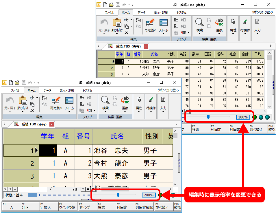 さらに、表の編集時と定義時、一括処理の編集時には画面上で表示倍率の変更が可能です。