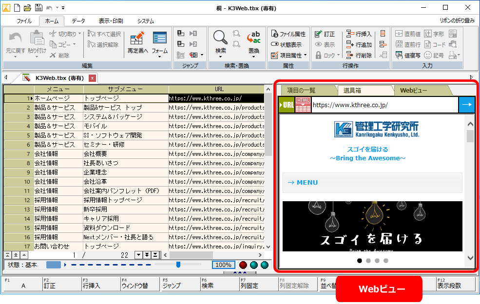 表に登録したURLが示すWebサイトの内容を、表と同じウィンドウの中に表示できます。