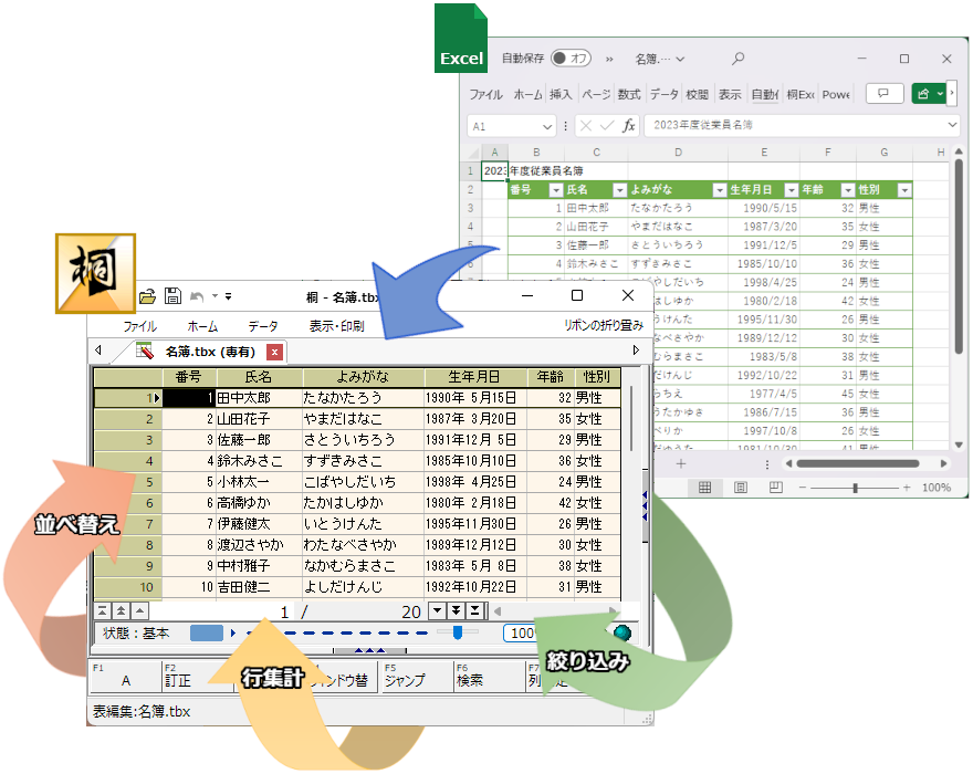 いったん桐の表になってしまえば、定型的な処理、並べ替え・絞り込み・行集計など、桐ならではの機能でどのようにでもデータを活用できます。変更点を確認する作業も、桐の表であれば併合機能が使えるので、簡単にチェックできます。