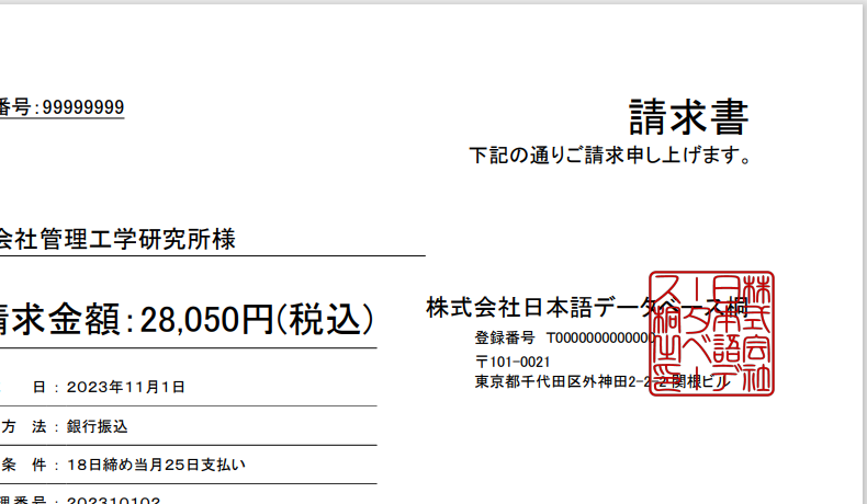 請求書や領収書などで印影を印刷する際に、以下の例のように文字領域と印影を重ねることができます。