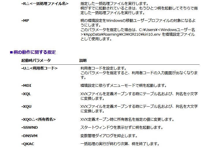 使い慣れた桐の環境設定を Windows の移動ユーザープロファイル環境下でも使えるように(-MP)、外部DBの定義時に接続先に合わせた変更を簡単に済ませたい(-XQL、-XQU)、一括処理の中身を見せず桐を実行専用に使いたい(-R)等のご要望に対応する起動時パラメータの追加を行いました。